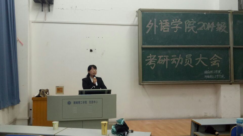 本站讯:11月6日晚七点,外语学院2014级考研动员大会在15308召开。我院院长汤卫根、副院长毛新耕和赵中宝出席了此次会议。大会由党总支副书记石红芳主持。
