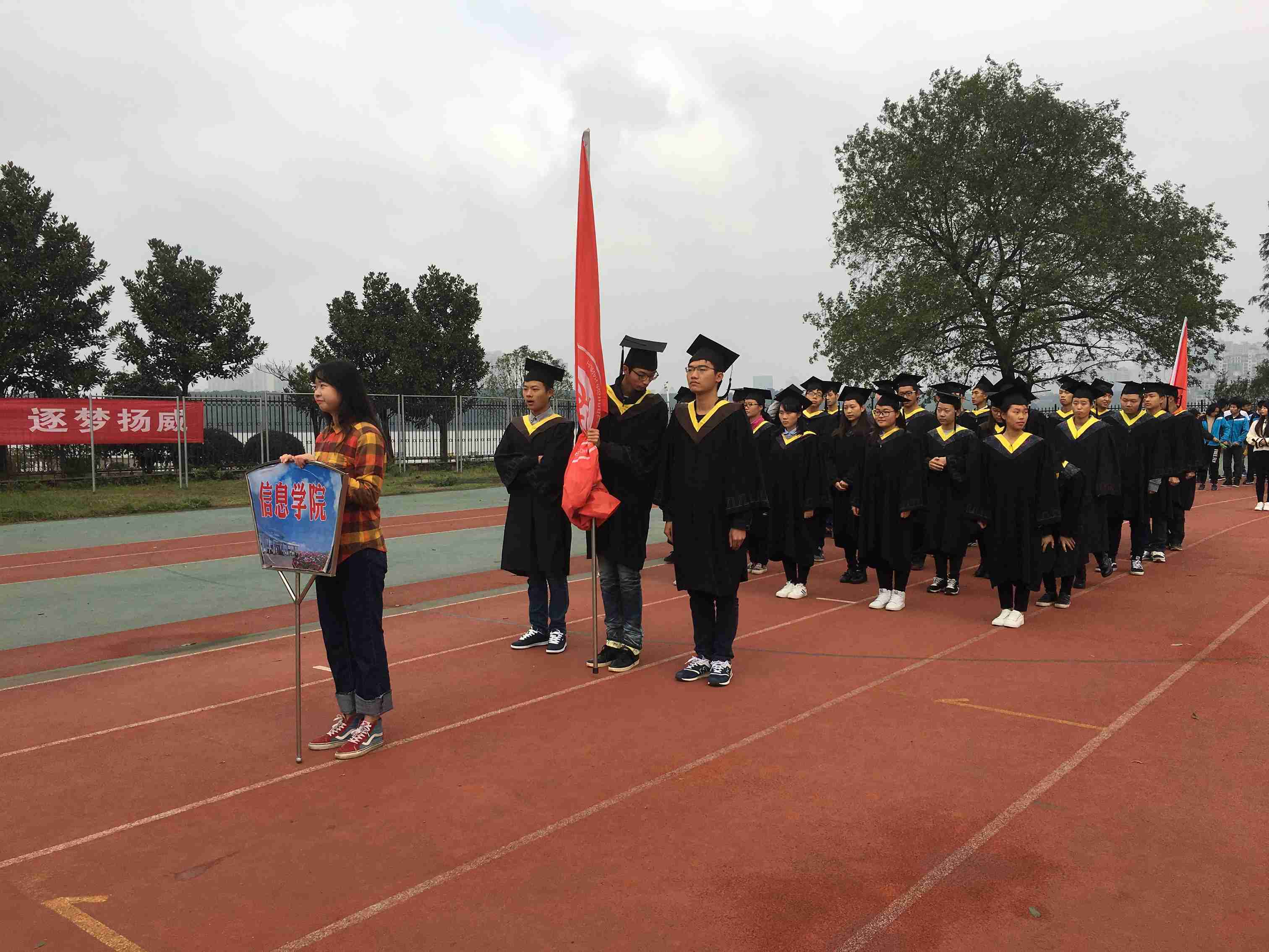 2016年11月10日上午,yL23411永利集团官网登录校运会于东院田径场隆重举行。8点10分,在温柔明亮的阳光下,运动会开幕式开始。信息学子们神采奕奕、精神饱满,身着黑色学士服的他们,怀着对身为信息人的自信,昂首挺胸地走过主席台,用最好的精神状态给人们留下了深刻的印象。