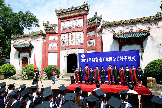 随后,校领导李明、卢先明、张国云、原校长余三定,外语学院院长汤卫根和湖南省屈原文化研究基地首席专家龚红林教授为毕业生行拨穗礼,授予毕业生学士学位。