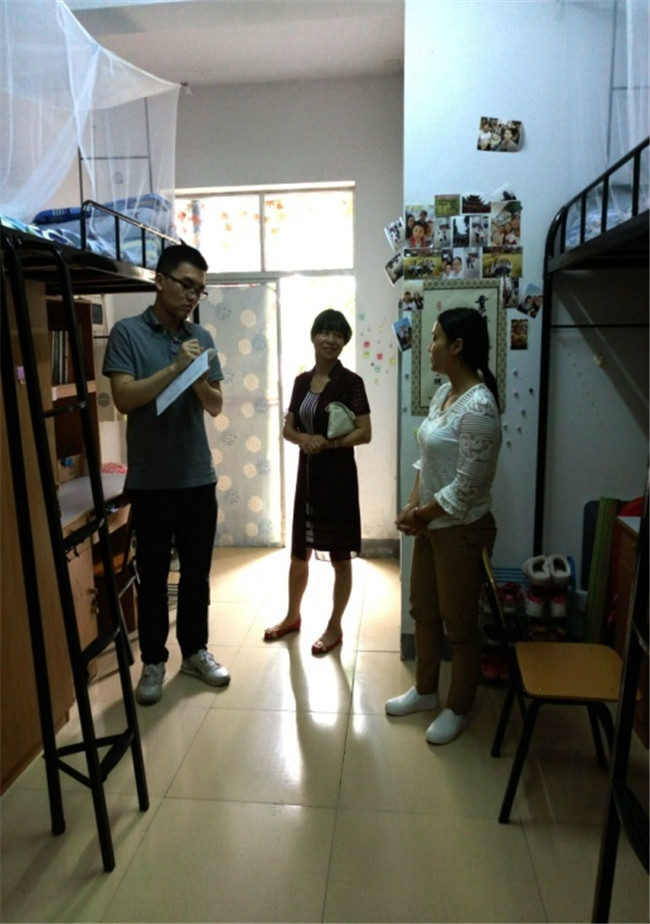 中文学院新闻部6月8日讯 6月8日上午,学生处副处长陈盛盛老师到南院十六栋学生宿舍走访、看望中文学院部分学生。我院党总支副书记贺波彬老师、辅导员刘子行老师陪同。