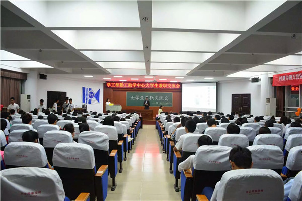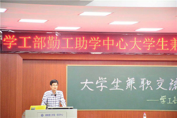 5月13日晚7点学校勤工助学中心于6栋学术报告厅召开了大学生兼职交流会,与会嘉宾有学工部部长王庆华、经管学院副书记王云朋、学生资助中心负责人以及岳阳合力文化传播有限公司总经理何炼五先生,会议由勤工助学中心学生助理主持。