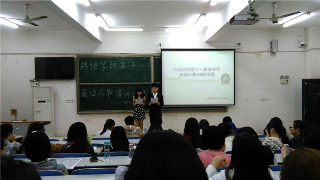 5月8日、15日晚,外语学院第十一届读书节演讲比赛先后于15115、15117举行。比赛由院团学分会学习部副部长常琳、张星航主持,特邀外语学院副院长毛新耕、院团学分会团副朱婕瑀、副主席郭佑虎、学习部部长陈亚希、学科部部长苏明辰、文娱部部长梁红艳担任嘉宾评委,各班亲友团纷纷到场为选手助阵。