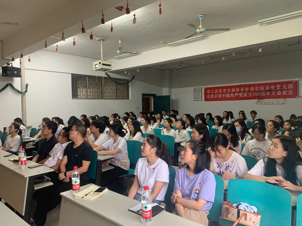 本网讯 7月1日上午8时,“庆祝中国共产党成立100周年大会”在北京天安门广场隆重举行。学工团委党支部牵手外语学院学生党支部在8505教室组织党员共同集中收看“庆祝中国共产党成立100周年大会”。