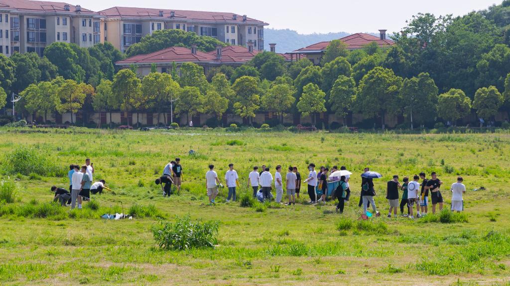 师生们头顶烈日,埋头于草坪杂草的清除之中,成为校园内一道靓丽的风景