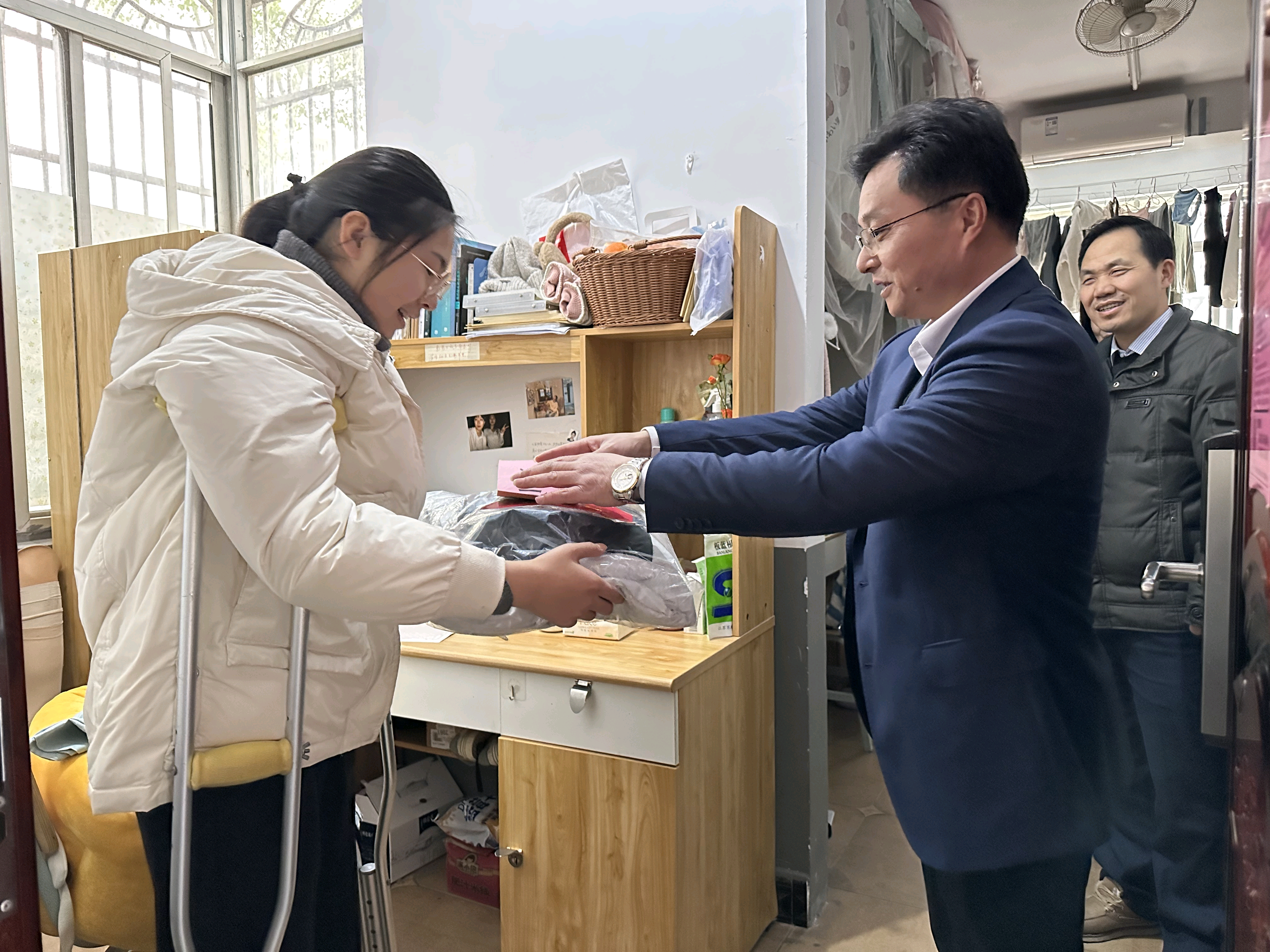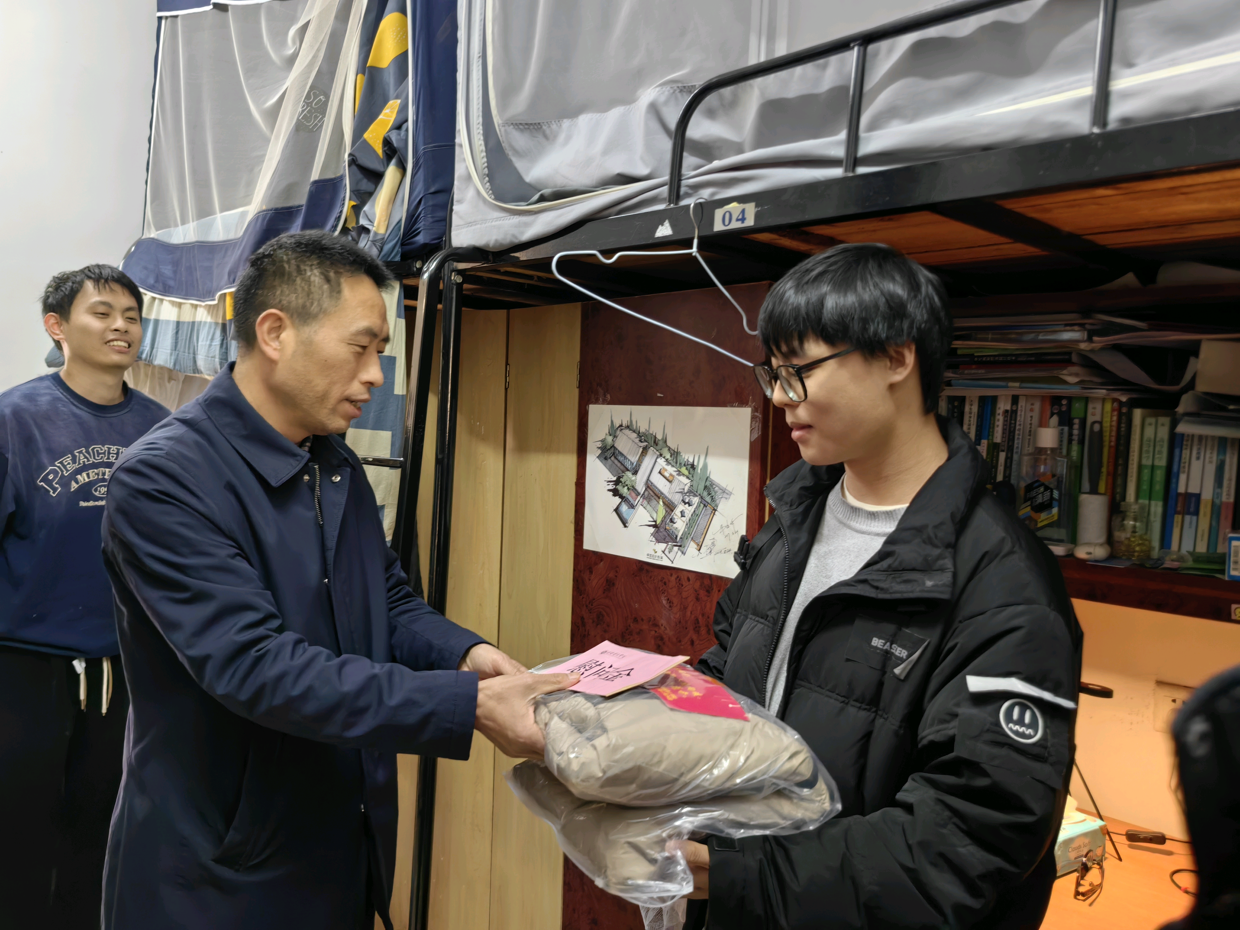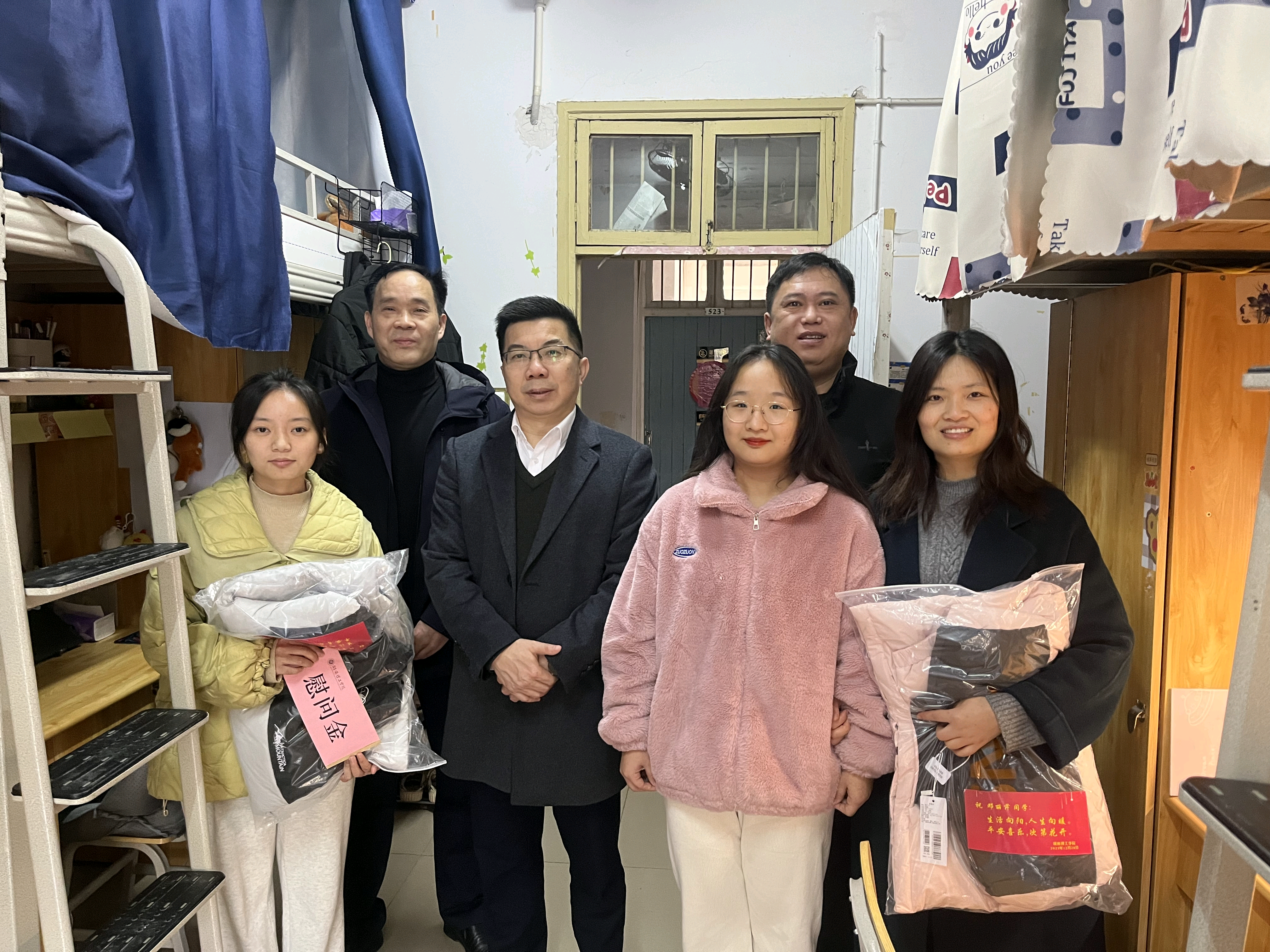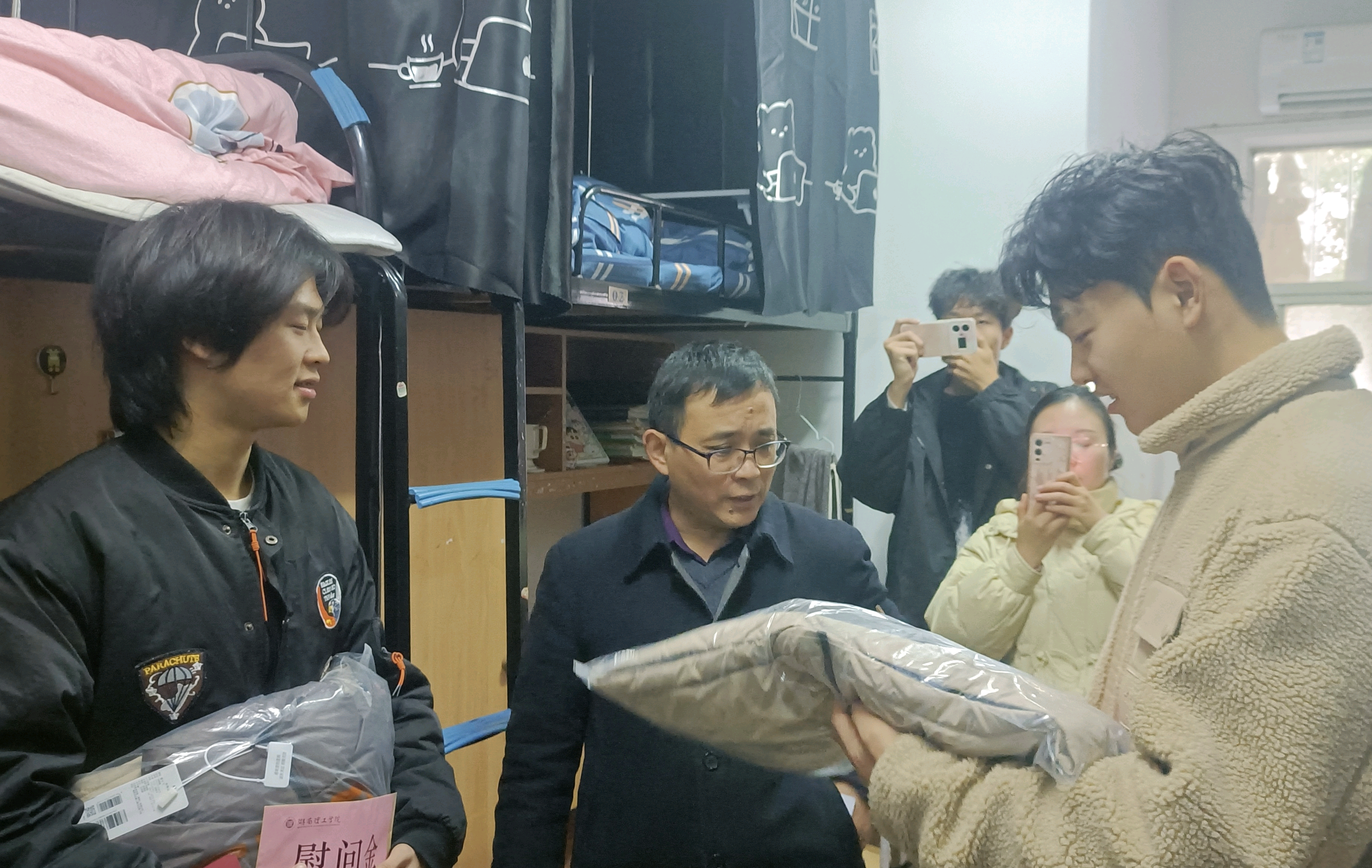 本网讯 12月28日下午,曾祥君、张国云、谢贵辉、徐小立、徐振祥、汤小红、丁跃浇等校领导,在学工部及相关学院负责人陪同下,带着新年的祝福,深入学生宿舍慰问贫困学生,并为他们送去御寒棉衣与慰问金。